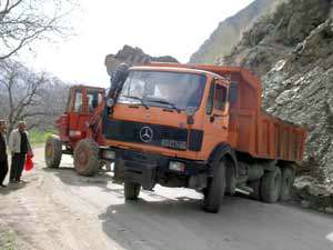 Bir hafta önce 2 kepçe, 1 greyder, 2 kamyon ve 8 personelle sürdürülen çalışmalarda, kar ve yağmur sularının beraberinde getirdiği toprak ve kaya parçaları, kamyonlara doldurularak yoldan çıkarılıyor.