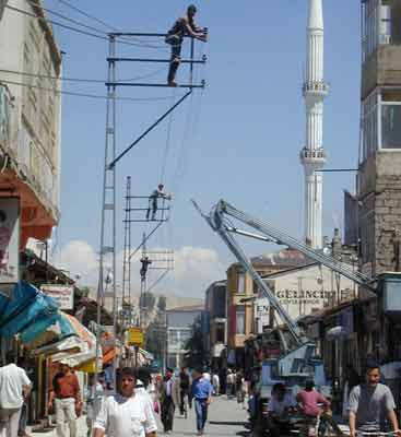 Van'ın Erciş İlçe merkezinde alçak gerilim hatlarını değiştirme çalışmaları devam ederken, Atatürk ve İnönü caddelerine iki gün süreyle elektrik verilemedi. Erciş'te orta gerilim şebekesinin yenilenmesinin ardından, şimdi de alçak gerilim şebekesi deşitiriliyor. Yetkili firmanın çalışmaları nedeniyle semtlerde enerji kesintisi yaşanıyor. Firma yetkilisi Ömer Köroğlu, bu yıl içersinde şehir merkezinin yüzde 35 oranında enerji şebekesinin yenileneceğini belirterek, "İletkenlerin değiştirilmesi semtlerde zorunlu enerji kesintisine yol açmaktadır. Bu arada işlek caddelerdeki çalışmalarımızı genelde hafta sonuna denk getiriyoruz. Ancak Atatürk ve İnönü caddelerindeki hat yoğunluğu, işlemlerin uzun sürmesine neden olurken, buradaki esnafımızı biraz da olsa huzursuz etmiştir. Hat yenilenmesiyle birlikte, merkezde düşük enerji problemi de çözülmüş oldu" dedi.