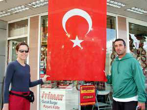 Afyonkarahisarın meşhur sucuk dönerini yemeyi ihmal etmeyen Emmanuil Triandyllou ve Eleftheria Kivernitou çifti, bir Türk bayrağının yanında hatıra fotoğrafı çektirdi.