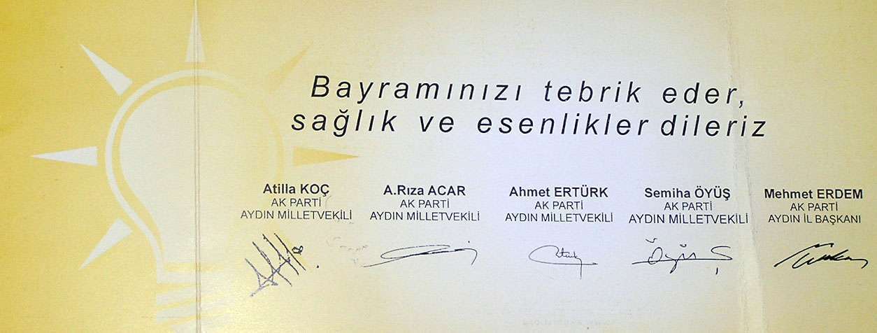 AK Parti Aydın Milletvekili Atilla Koç, A. Rıza Acar, Ahmet Ertürk, Semiha Öyüş ve İl Başkanı Mehmet Erdem vatandaşların bayramını ortak bastırdıkları bayram tebriği ile kutladılar. Parti teşkilatının bu uygulama ile vatandaşa aynı zamanda parti içindeki birlik ve beraberliği göstermek istedikleri ve ekonomik olarak ciddi tasarruf sağladığı bildirildi.