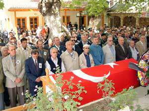 Kaleiçi Camiinde kılınan öğle namazının ardından Korkut Efenin Türk bayrağına sarılı naşı, yine vasiyeti üzerine Kuşadasının Caferli Köyünde toprağa verildi.