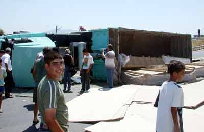 TIR’ın devrildiği sırada olay yerinden geçmekte olan bir yolcu otobüsü, önünde devrilen araca çarpmamak için yola saçılan suntaların üzerinden geçti.
