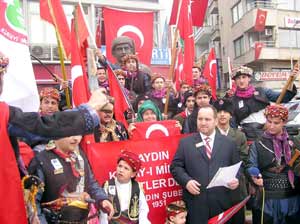Mersinde Nevruz kutlamaları sırasında Türk bayrağına yapılan çirkin saldırıya tepki gösteren Türkiye Kuva-yi Milliye Mücahitler Derneği Aydın Şubesine bağlı efeler, yöresel kıyafetleri ile basın açıklaması yaparak, Atatürk anıtı önünde sırtlarına aldıkları Türk bayrağı ile zeybek oynadı.