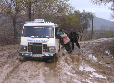 Her yağış sonucu oldukça ilginç manzaraların yaşandığı köy yolunda, vatandaşlar dün akşam yine yolda kaldı. Çamura saplanan araçları kurtarmak için saatlerce uğraşan köylüler, araç kurtarmaktan zeytin toplayamadıklarını belirtti.