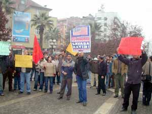 EMEP İl Başkanı Özgür Gündoğan’ın okuduğu basın açıklamasında, ABD’nin ilk olarak terör bahanesiyle Afganistan’a girdiği, binlerce sivili katlettiği, yaklaşık 2 yıldır ’Irak’a demokrasi götürüyorum’ bahanesiyle 100 bine yakın insanı öldürdüğü öne sürdü. Gündoğan, AB’ye uyum yasaları ile estirilen ılımlı havanın aslında sadece uyutmadan ibaret olduğunu söyleyerek, "AKP hükümetinin masum Müslüman halkın ölümüne verdiği desteğe, işbirlikçiliğine, para ve petrol uğruna gözü dönmüş Amerikan emperyalizmine Türkiye halkının Kürt’ü ile Türk’ü ile Lazı’yla, Çerkezi’yle, Sunnisiyle, Alevisi’yle cevabı hayır olacaktır" dedi.