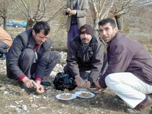 Temel atma törenine katılan diğer vatandaşların da ikramlardan almak istemesi üzerine, görevliler hep birlikte taşlarla ceviz kırdılar.