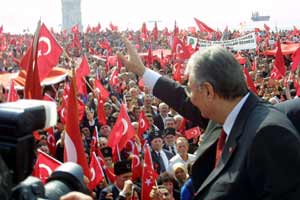 Nevruz kutlamalarında Türk bayrağına yapılan saygısızlık, İzmirde "Türk Bayrağına Saygı" yürüyüşüyle protesto edildi. CHP Genel Başkanı Deniz Baykalın yanı sıra birçok milletvekilinin katıldığı mitingde, Türk bayrağına saygısızlık yapanlara lanet yağdı.
