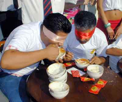 Başlama işareti ile birlikte yarışmacılar önlerine konulan tabaklardaki tatlıları yemeye başladı. En çok tatlı yiyenin birinci olacağı yarışmada, yarışmacılar tatlıları üstlerine dökerek, yüzlerine bulaştırarak yedi.