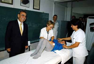 Konuşmaların ardından Eşrefpaşa Hastanesi doktorları 4 branşta öğrencileri sağlık muayenesine alırken, Başkan Kocaoğlu’nun Çocuk Sağlığı ve Hastalıkları Uzmanı eşi Türkegül Kocaoğlu da beyaz önlüğünü giyerek çocukları muayene etti.