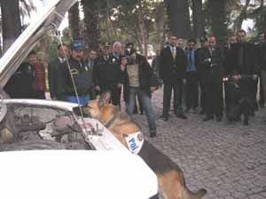 Alsancak ve Çeşme Limanları’ndaki gemi, liman ve araç arama çalışmalarını tamamlayan gruba, İzmir Emniyet Müdürü Halil Tataş, Fuar’daki İzmir Sanat Cafe’de çay verdi. Bu sırada kursa katılan 13 dedektör köpek değişik yerlere saklanan uyuşturucu maddeleri bulma gösterisi yaptı. Saklanan uyuşturucu maddeleri kısa sürede bulan köpekler, Tataş ve diğer izleyenlerden büyük alkış aldı. Gösteriye, İzmir Emniyet Müdürlüğü’nün bomba arama köpekleri Nick ve Reks, bir aracın içine saklanan kitap şeklindeki bomba düzeneğini kısa sürede buldu. Köpeklerin gösterisi ilgiyle izlendi.