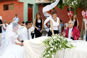 Karabağlar Cevdet Güçlüer İlköğretim Okulu'nda gerçekleştirilen törende çiftlerin nikahını Konak Belediye Başkanı Muzaffer Tunçağ kıyarken, şahitliklerini de Türk Anneler Derneği İzmir Şubesi Onursal Başkanı Fatma Dayıoğlu ile İl Genel Meclisi Üyesi İsmet Tutar yaptı.