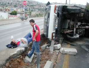 Konak'ta kaygan yolda direksiyon hakimiyetini kaybeden süt kamyoneti kaldırımlara çarptı. Yenişehir Yeşildere mevkiinde özel bir şirkete ait kamyonet yolun kaygan olması sebebiyle kaldırıma çarptı.