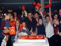 Gecede Narlıdere Belediye Başkanı Abdül Batur ve CHP İlçe Başkanı Halil Serbeş çocuklarla birlikte 80. yıl pastasını kesti. Gecede bütün salon ayakta 10. Yıl Marşı’nı söylerken, halaylar çekilerek zeybekler oynandı.
