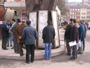 Kütahya’da bir esnafın çınar ağacına astığı gazeteleri okumak isteyen vatandaşlar uzun kuyruklar oluşturuyor. Zafer Meydanı’nda büfe işleten Tahir Kılıçaslan, yaptırdığı özel gazete kalıplarını çınar ağacına monte edip halkın ücretsiz olarak gazete okumasını sağlıyor.
