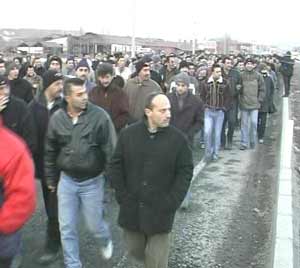 Kütahyada 2 ayrı porselen fabrikasında çalışan yaklaşık 3 bin işçi, dün gece 2 servis aracının kaza yapması neticesinde 1 işçinin hayatını kaybetmesi, 24 işcinin de yaralanması üzerine, servis hizmeti veren firmayı protesto etmek için 8 kilometre yürüdü.