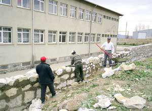Müdür Hüseyin Güler, okul hizmetlisi Hasan Delibaş ve bir ustayla birlikte yarım kalan duvar inşaatında gün boyu amele gibi çalışıyor. Kazma kürekle bütün gün çalışan Güler, "Okulumuzun ihata duvarını örmeye bir süre evvel başladık. Bir usta, okulumuzun hizmetlisi ve ben, gün boyu birlikte çalışarak inşaatı bir an önce bitirmek istiyoruz. İnşaat malzemelerinin taşlarını Afyonkarahisarın Azeyin Belediyesinden temin ettik. Geriye kalan kum ve çimentoyu ise hayırsever halkımız bizden esirgemedi" dedi.