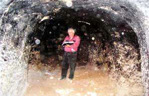 "Çıktığımız platformun yanında, kapı girişleri bozulmuş iki oda, girişi taşla dolmuş başka bir oda ve bunların yanında, içi çift kat sıvanmış, pembemsi 170 cm çapında bir su sarnıcı bulunmaktadır. Dağcı arkadaşımız Fuat Kuloğlu, sol tarafta görülen bir deliğe doğru gitti. Kendisine orada dolaşmanın tehlikeli, yamacın dar ve dik olduğunu söyledim. O yine yoluna devam etti ve deliğin içinde kayboldu. Bir müddet sonra delikten başını çıkardı ve Burada bir şehir var diye seslendi. Burasının girişi yıkılmış. Üç basamaktan sonra geniş bir koridora açılıyor. Koridorun yüksekliği 2 metreden fazla. Ve oldukça geniş. Salonun solunda, her iki odanın ortasına pencere açılmış 8 oda, sağında ise ovaya açılan kapı ve pencereler var. Üst katın sonunda 4 oda daha görülmektedir. Odalardan birisinin içi yarasa dolu. Odaların ölçüleri farklı."