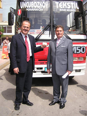 Konuşmaların ardından Belediye Başkanı Bülent Kar ile KENTKART Ltd. Şirketi Genel Müdürü Ercan Ünal bir yolcu otobüsü kapısına bağlanan kurdelayı keserek, uygulamayı başlattı.