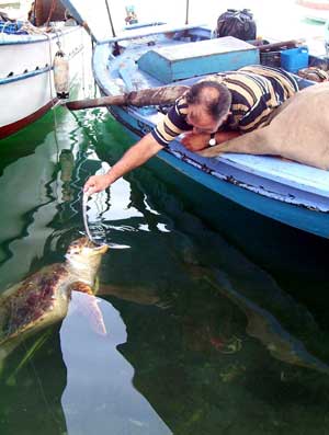 "Her sabah saat 09.00 sıralarında kıyıya 500 metre kala yolumuzu gözlüyorlar. Bu kaplumbağaların hepsine bir isim koydum, bugün bir tek Hatice geldi; ama bazen Aziz, Mehmet, Bayram da geliyor. Bu isimlerle seslendiğimiz zaman geliyorlar. Bunlar sadece benim teknemin motor sesini duyunca kıyıya gelirler. Ben her gün yakaladığım balıkların satılmayacak olanlarını bunlara veriyorum. Yengeç ve balıkları elimden yiyorlar. Günde ortalama 5 kilo balık veriyorum" dedi.