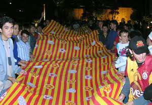 Galatasarayın Türkiye Kupası final maçında ezeli rakibi Fenerbahçeyi 5-1 mağlup ederek 14. kez kupayı müzesine götürmesini, Uşaklı Galatasaray taraftarları 70 metrelik bayrak açarak kutladı.