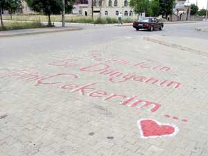 Uşak merkez Karakıran Mahallesi'nde yol üzerine kimin yazdığı bilinmeyen aşk sözcükleri görenlerin ilgisini çekiyor.