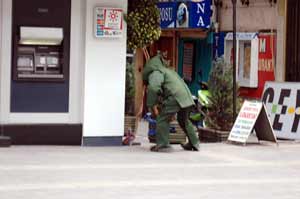 Saat 10.30 sıralarında İsmetpaşa Caddesi'ndeki HSBC Bank Uşak Şubesi'nin otomatik para çekme makinesi önüne bırakılan şüpheli bir poşet, caddeden geçen vatandaşların dikkatini çekti.