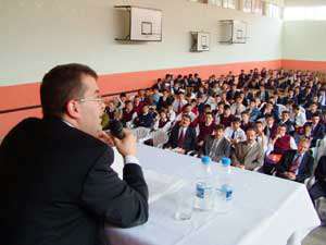 Eşme Spor Salonunda düzenlenen konferansa Kaymakam Mehmet Ceylan, Garnizon Komutanı Yüzbaşı Halil Anapa, İlçe Milli Eğitim Müdürü Recai Keleş, okul müdürleri, öğretmenler ve çok sayıda öğrenci katıldı.