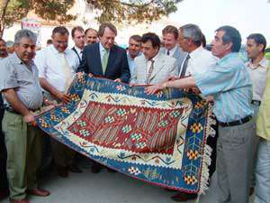 Eşme Belediye Başkanı Ahmet Yıldırım, DSP Genel Başkanı Zeki Sezere Eşme kilimi hediye etti. Vatandaşlarla ve esnafla görüşen Sezer, daha sonra Eşmeden ayrıldı.