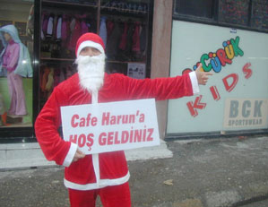 Bir eğlence mekanının tabelasını eline alan Noel Baba, yoldan geçen vatandaşları yılbaşı gecesi eğlenceye davet etti.