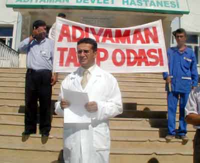 Adıyaman Devlet Hastanesi’nde görev yapan doktor ve personeli hastane bahçesinde toplanarak bir basın açıklaması yaptı. Adıyaman Tabipler Odası adına açıklamayı okuyan Dr. Nihat Yıldırım, tüm olumsuzluklarda sağlık çalışanlarının sorumlu tutulduğunu belirterek, "Sağlık sorunu olan kişi ve yakınları, başvurdukları sağlık birimlerinde teknoloji, fiziki altyapı, personel yetersizliği, idari mekanizmadaki problemleri hiç düşünmeden tüm çözümü sağlık çalışanlarında görmektedirler. Sorunlara sağlıklı eleştiri veya çözüm önerileri üretmek yerine küfür, hakaret ve şiddet sergilenmektedir. Sağlık çalışanları günah keçisi konumuna getirilmektedir" dedi.