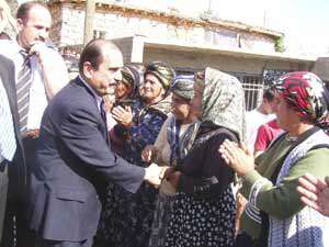1.5 kilometrelik bir kuyruk oluşturan belde halkı, tek sıra halinde yol kenarına dizildi. Vali Hikmet Tan, belde girişinde aracından inerek sırayla vatandaşlar ile tokalaşmaya başladı. Vali Hikmet Tan tek tek tokalaşırken, arkasında bulunan diğer protokol üyeleri tokalaşmayı yarım kesti. Kadınlar alkışlar ve zılgıtlar eşliğinde Vali Tanı karşılarken, bazı kadınlar Vali Hikmet Tanın boynuna sarıldı. 1-1.5 kilometreye ulaşan sırada bulunan insanlar ile tek tek selamlaştıktan sonra programa geçildi.