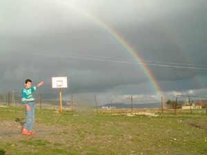 Güneşin çıkmasıyla kendilerini dışarı atan çocuklar, gökkuşağı sürpriziyle karşılaştı. Gökyüzünü rengarenk görüntüsüyle süsleyen gökkuşağı, yaklaşık beş dakika kendini gösterdi.