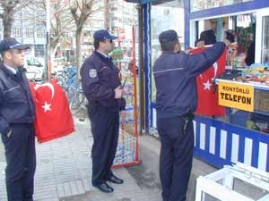 Nevruz Bayramı etkinliklerinde Türk bayrağına yönelik saldırı nedeniyle Batman Valiliği tarafından yarın düzenlenecek olan Bayrağa Saygı Yürüyüşü öncesi polis ekipleri, esnafa bayrak dağıttı.