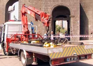 Diyarbakırda Turizm Haftası nedeniyle çeşitli etkinlikler düzenlenirken, tarihi kentin en önemli turistik mekanlarından biri olan Diyarbakır surlarından geçmekte olan belediye çekici aracı, Urfa Kapının üst bölümünde bulunan kolonu parçaladı.