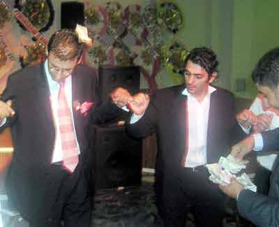 Gösterinin ardından çiftetelli oynayan gelin ve damadı para yağmuruna tutan konuklar, daha sonra hızını alamayarak sahneye çıkan şarkıcı Hüseyin Süren’in üzerine çantayla para boşalttılar.