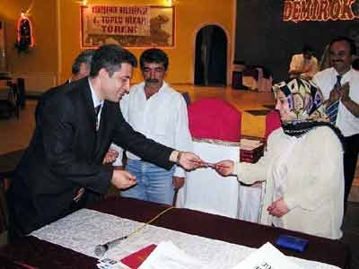 Demirok Tesisleri’ndeki törende ilk olarak, 13 yıllık evli ve 7 çocuk sahibi Mehmet Aslan ve Fatma Yavuz’un resmi nikahlarının kıyıldı. Daha sonra Fevziye Serin ile nikahı kıyılan Mehmet Balkay, 15 yıllık evli olduğunu belirterek, "Benim iki eşim ve 3 torunum var. Yasalara göre bir eşe resmi nikah kıyılacağı için, ilk eşim yasalara uymak uğruna imam nikahlı kalacak. Bu nedenle biraz daha genç olan ikinci eşim Fevziye Sevim ile resmi nikahımızı kıydık" dedi.