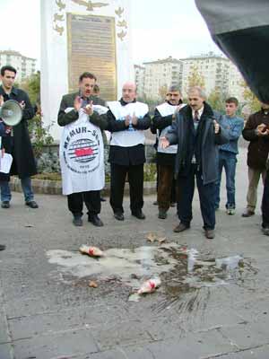 Memur-Sen Konfederasyonu Diyarbakır İl Başkanlığı ve Toplumsal Hakları ve Değerleri Koruma, Eğitim, Yardımlaşma ve Dayanışma Derneği (Toplum-Der), Felluce’de direnişçilere yönelik yürütülen operasyonları, Diyarbakır’da Coca Cola dökerek protesto etti.