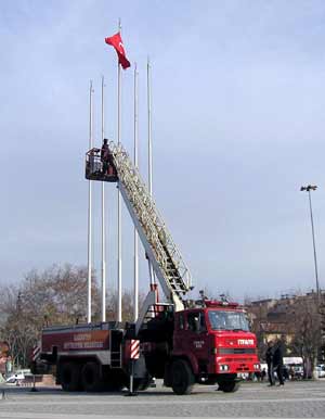Gaziantep’te, boş direklere takıldığı için dalgalanamayan ve parçalanmak üzere olan Türk Bayrağı, itfaiye aracına çıkan zabıta memuru tarafından takıldığı yerden kurtarılarak dalgalanması sağlandı.