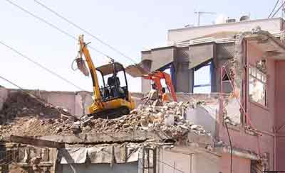 Tehlikeyi asgari düzeye indirmek için sokak trafiğe kapatılırken, iş makineleri vinçlerle 5. kata çıkarıldı. 5. kata çıkarılan dozer, kepçe ve darbeli yıkım araçları, 5. kattan itibaren kat kat binayı yıkmaya başladı. İş makinelerinin üst katlarda çalıştığını gören vatandaşlar ise hayretler içinde kaldı.