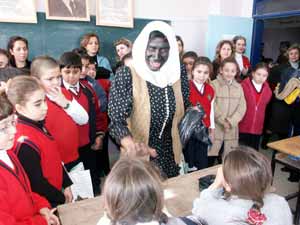 Adaklı Köyü’ne eşek üstünde İbiş karakteriyle giren Murat Doğan’ı karşılarında gören köylü çocuklar çok şaşırdı. İbiş, çocukları esprileriyle güldürürken, kardeş okul öğrencilerinin harçlıklarını biriktirerek aldıkları hediyeleri öğrencilere dağıttı. Tiyatrocu Murat Doğan, daha sonra öğrencilerin karşısına Arap Bacı karakteriyle çıktı. Öğrenciler, okulun koridorunda karşılarında Arap Bacı’yı görünce korktu. Daha sonra şaşkınlıklarını üzerinden atan öğrenciler, İbiş gibi Arap Bacı’yı da sevdi. Arap Bacı, bir sınıfa Kolej Vakıfı öğrencileriyle birlikte girerek, hem ortaoyunundan örnekler sundu hem de öğrenci arkadaşlarının aldığı hediyeleri dağıttı.