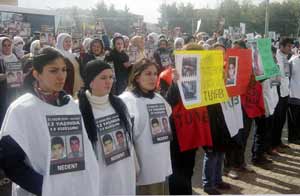 Hükümet Konağının yanındaki binaya ise 1980 yılından beri faili meçhul giden şahısların fotoğrafları büyük bir bez afişe yapıştırılmış şekilde asıldı. Bu arada, kalabalık grup tarafından sık sık atılan sloganlara, duruşmanın başlamasıyla engel olmak isteyen Mardin Emniyet Müdürlüğü yetkilileri ise kalabalık tarafından protesto edildi.