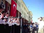 Atatürk Anıtı'na çelenk konulmasıyla başlayan tören, 1 dakikalık saygı duruşu ve Fahrettin Önen İlköğretim Okulu Müzik Korosu'nun, müzik Öğretmeni Burcu Gökkaya yönetiminde okuduğu İstiklal Marşıyla devam etti.