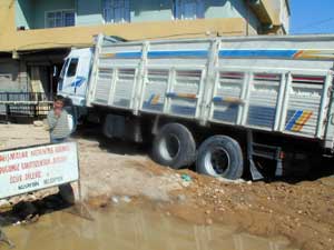 Edinilen bilgiye göre, Nusaybin Kışla Mahallesi Seher Sokakta önceki gün belediye işçilerinin su şebekesi yapılması için açtığı çukur daha sonra kapatıldı. Çukurun kapatılmasına rağmen Veysi Merkit yönetimdeki 47 AE 600 plakalı kamyon, 36 tonluk çimento yüküyle yumuşak zeminli çukurun üstünden geçmek isterken çukura gömüldü.