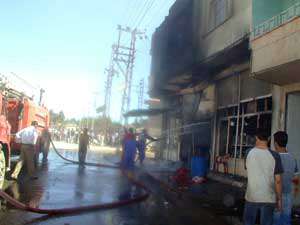 Mardinin Nusaybin İlçesindeki madeni yağ ve pamuk dükkanında çıkan yangında, 2 dükkan ve 1 ev tamamen yandı.