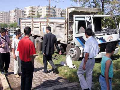 Gaziantep istikametinden Şanlıurfa istikametine seyir halindeki Cuma Polat yönetimindeki 63 PV 178 plakalı kamyon, frenin patlaması sonucu virajı alamayarak kaldırıma çıktı. Kaldırımdaki levhaları biçerek karşı taraftaki parka giren kamyon direkleri kırdıktan sonra durabildi. Kazada yaralanan kamyon sürücüsü Cuma Polat, Devlet Hastanesi’ne kaldırıldı.