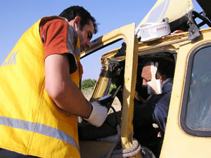 Şanlıurfa-Diyarbakır karayolunda meydana gelen trafik kazasında kamyonda sıkışan sürücü yaklaşık bir saat boyunca kurtarılmayı bekledi. 112 ekiplerinin boyunluk takarak müdahale ettikleri sürücüyü kurtarmaya gelen kaza kırım ekibi, aletleri çalıştıramayınca cep telefonuyla yardım aldı.