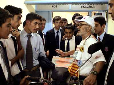Bisikletle gezerek doğayı kirletenleri protesto ettiğini belirten 77 yaşındaki emekli öğretmen ilçe merkezinde bir süre gezinti yaptı. Daha sonra öğrencilerle sohbet eden emekli öğretmen, "Ülkemiz her gün biraz daha çölleşiyor, çevre bilincimiz yok denecek kadar az. Ormanlarımız katlediliyor. Gelecek nesillere içinde bulunduğumuz tehlikeyi anlatmak, doğayı kirletip katledenleri protesto etmek amacıyla Sivas ilinden bisikletle yola çıktım. Günde 40 kilometre yol giderek eylemimi sürdürüyorum. Bundan sonra Diyarbakır, Batman, Mardin, Şanlıurfa’ya gideceğim oradan da tekrar Sivas’a döneceğim" dedi.