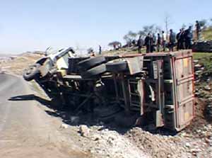 Alınan bilgilere göre Akabe mevkiinden Şanlıurfa istikametine göre seyreden Ömer Atmaca yönetimindeki 63 KN 354 plakalı gübre yüklü kamyonun freni patladı. Yokuş aşağı bir süre giden kamyonun sürücüsü Ömer Atmaca, şehir merkezine doğru inen aracını yaptığı manevrayla yolun yanına devirerek meydana gelebilecek olası büyük bir kazayı önledi. Kazada araç sürücüsü yara almadan kurtulurken, yanında bulunan babası Halil Atmaca hafif yaralandı.