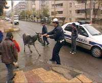 Bir süre sonra eşekten rahatsız olan vatandaşlar, itfaiyeye haber verdi. İtfaiyenin de olaya duyarsız kalması üzerine, İbrahim Halil Polat isimli motosiklet sürücüsü, durumu polise bildirdi. Olay yerine gelen polisler, başıboş eşeği yoldan çekmek için çalışmaya başladı. İnatçı eşek, yaklaşık bir saatlik uğraşın sonunda yol kenarına çekilebildi.