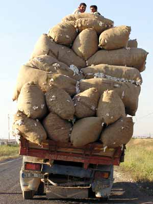 Bu İlginç fotoğraf, Şanlıurfa’nın Akçakale ilçe yolu üzerinde çekildi. Kendi hayatını, araçların güvenliğini hiçe sayan bir sorumsuz bir kamyon şoförü, kamyonuna tıka basa doldurduğu pamuk balyalarının üzerine iki de yolcu bindirmiş.